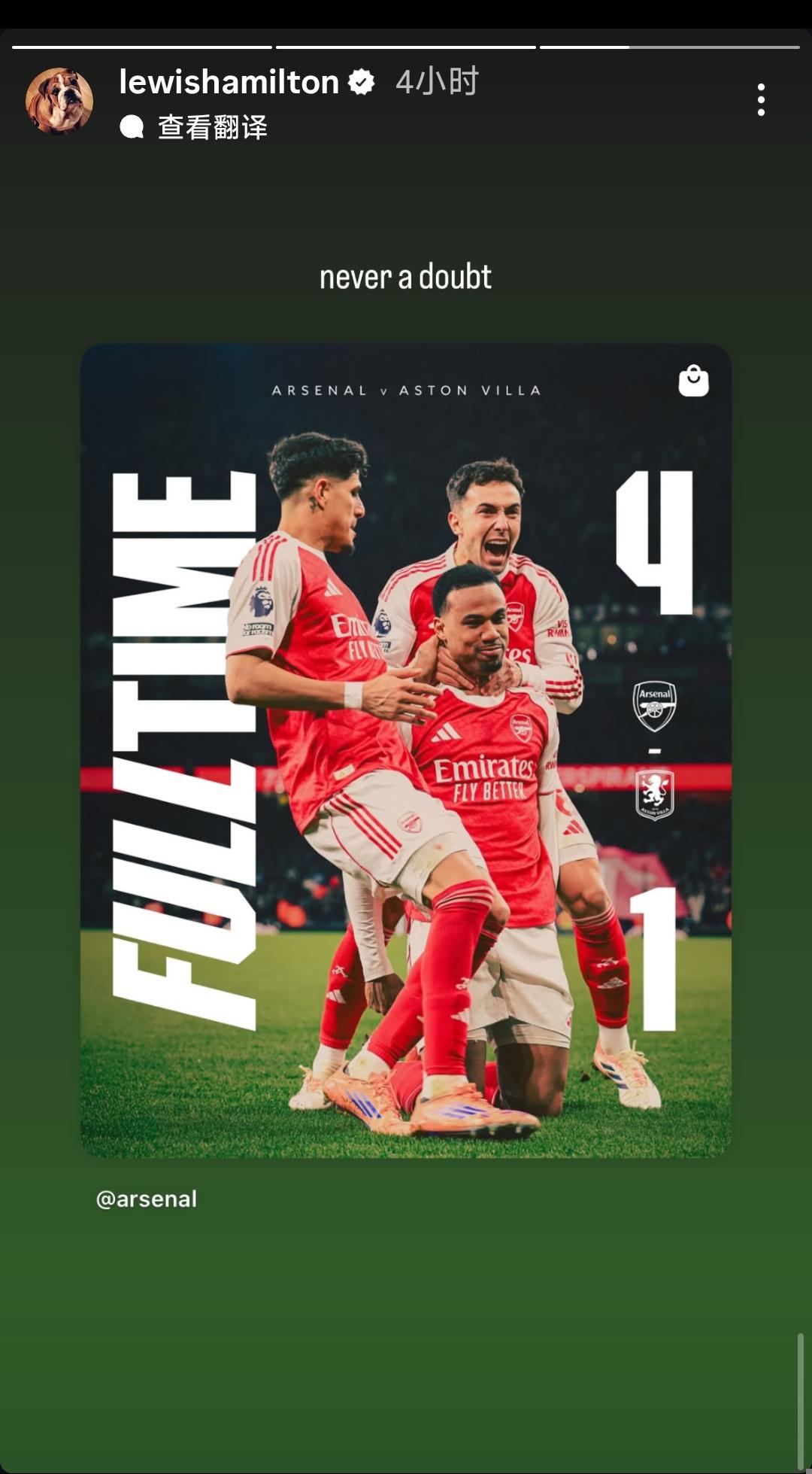 法拉利車手劉易斯-漢密爾頓賽后更新了動態(tài),慶祝了阿森納的這場勝利,并配文:“毫無疑問!”