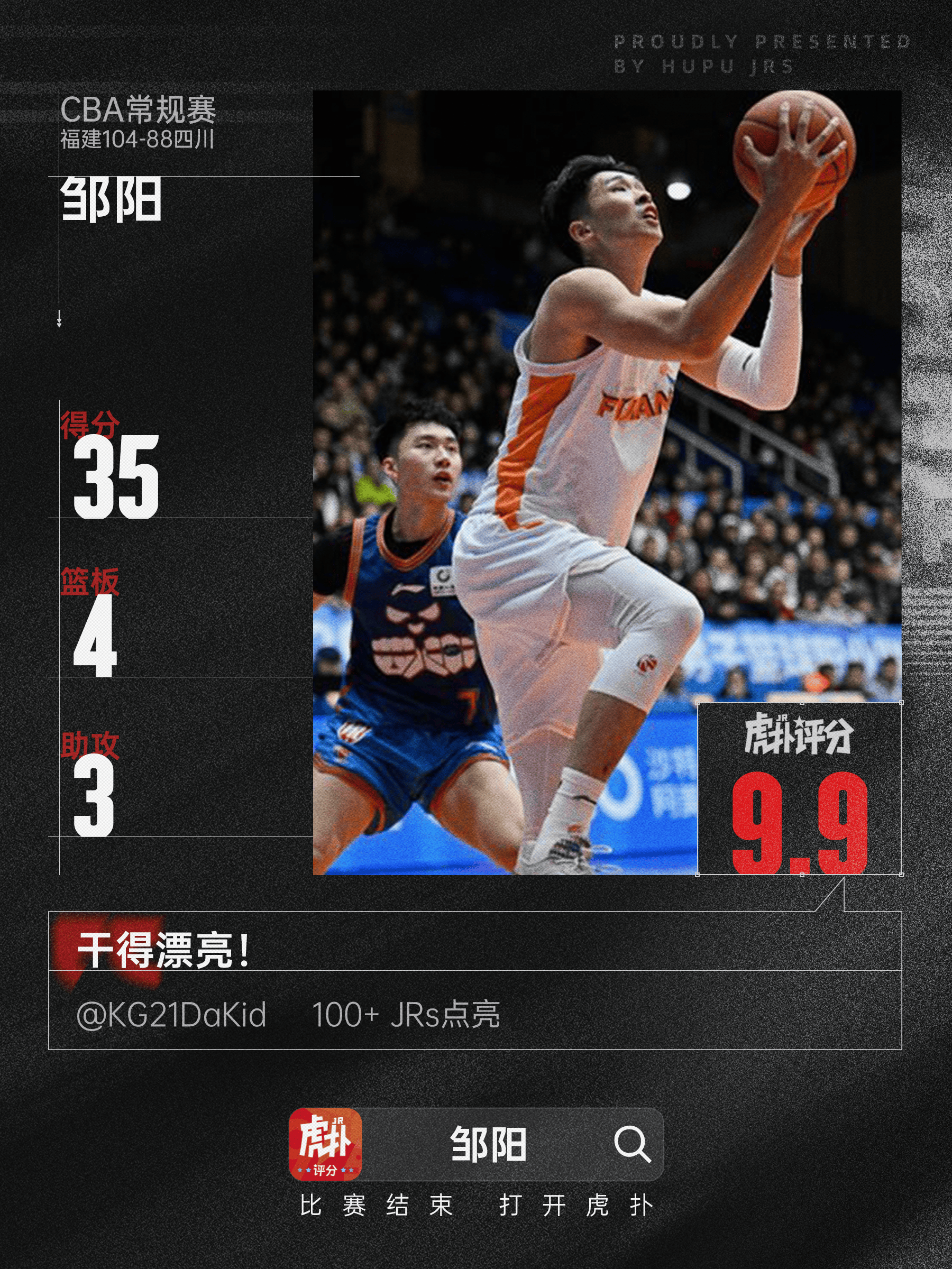 [流言板]生涯之夜!鄒陽(yáng)全場(chǎng)17中13,三分9中7砍下35分4籃板3助攻