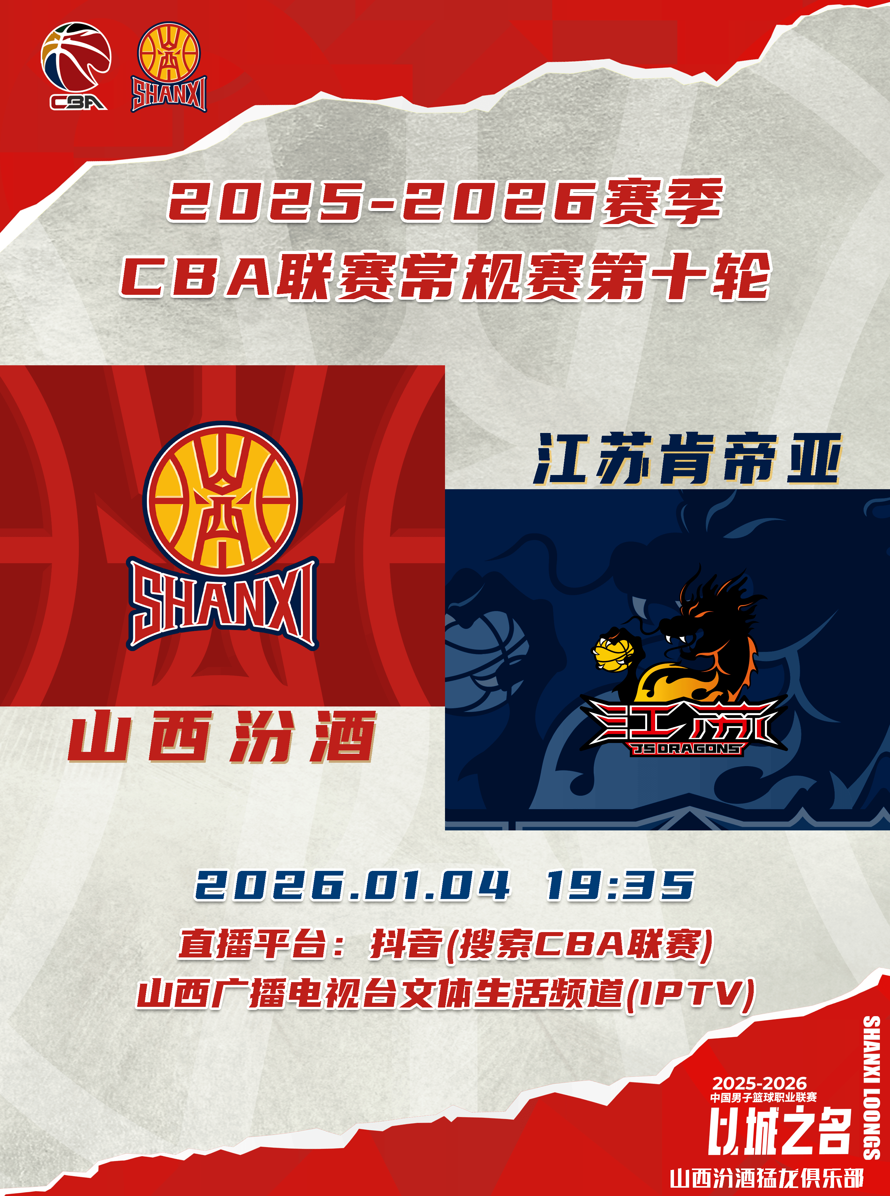 北京時間2026年1月4日19:35,2025-2026賽季CBA聯(lián)賽常規(guī)賽第十輪繼續(xù)進(jìn)行,山西汾酒繼續(xù)坐鎮(zhèn)主場,迎戰(zhàn)江蘇肯帝亞,